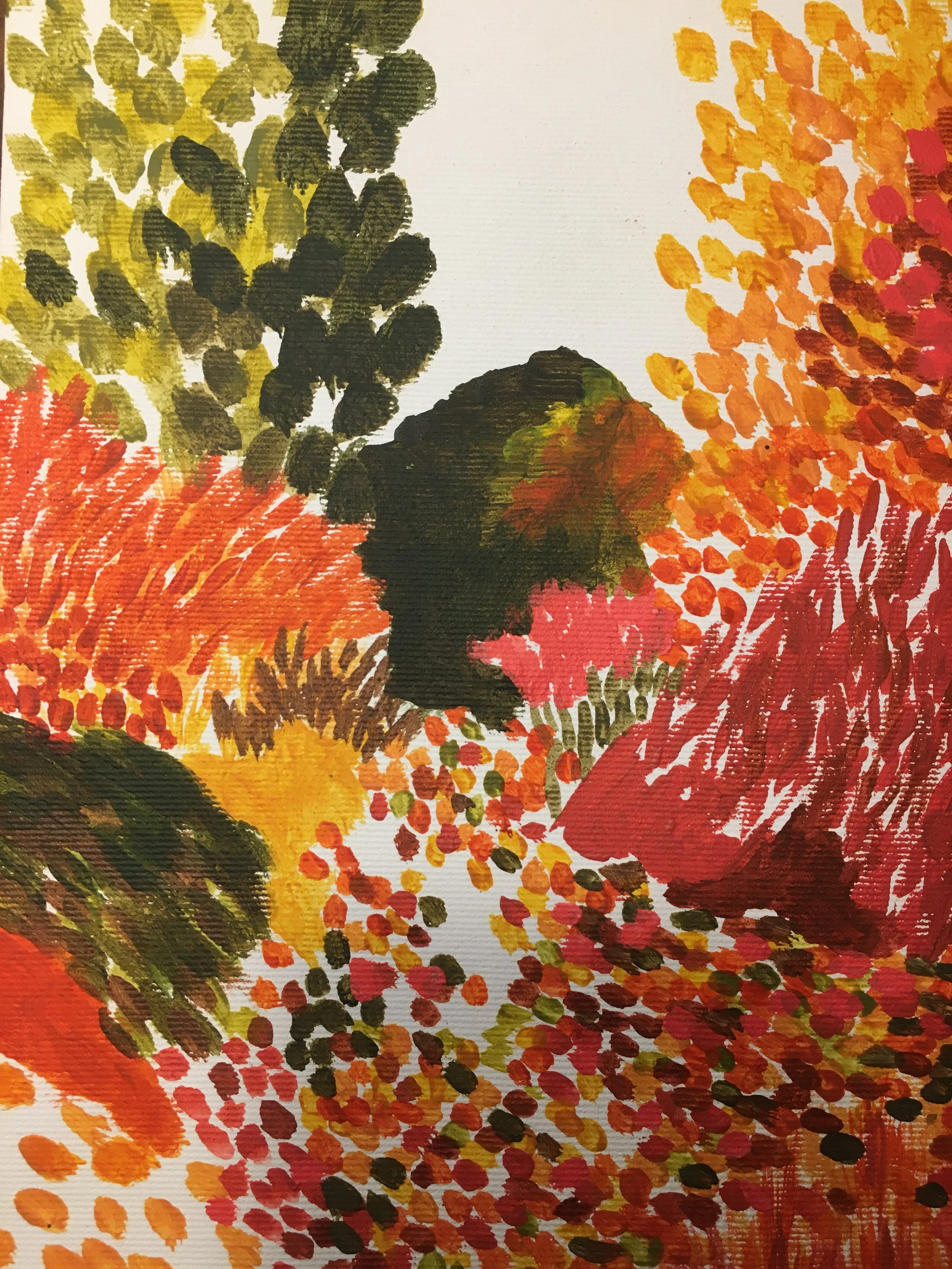 “This piece of artwork was created in fall of 2021. The autumn season was very inspiring and it allowed me to express the love I have for the majestic colors of the fall time. It also revealed the love I have for the outdoors. This especially reflects on where I live, in Switzerland, where there is beautiful and refreshing nature. Relating to the style of this artwork I was inspired by one of my favorite artists, Henri Matisse. I implemented one of my favorite techniques that he used which were called Pointillism. It is one of my favorite ways to express myself through art.”